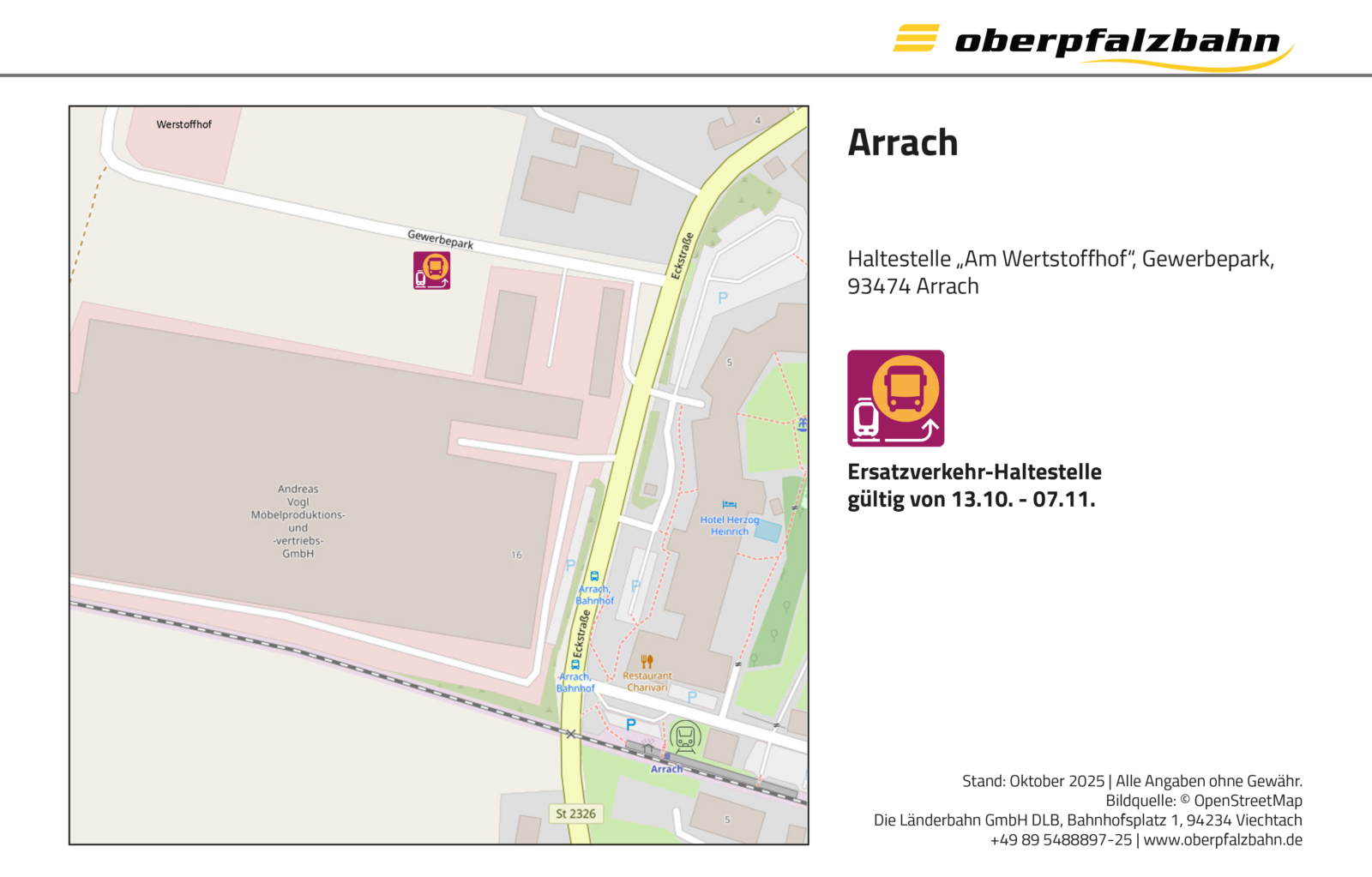 Der Ersatzbus bedient nicht mehr die Haltestelle Arrach, Bahnhof, sondern hält ab sofort an der Haltestelle „Am Wertstoffhof“, Gewerbepark 4.