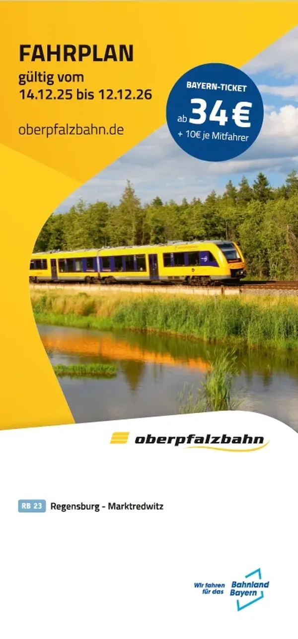 Enthält Fahrpläne der Linie RB 23 Regensburg - Marktredwitz, ausgewählte Sondertickets und weitere Reiseinformationen.