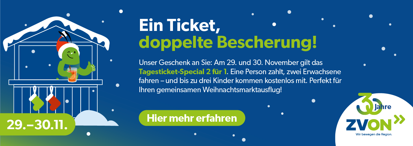 Der ZVON hat ein Geschenk für Sie: Am 29. und 30. November gilt das Tagesticket-Special 2 für 1. Eine Person zahlt, zwei Erwachsene fahren, und bis zu drei Kinder bis 15 Jahre sind kostenlos dabei. Perfekt für Ihren gemeinsamen Weihnachtsmarktausflug!