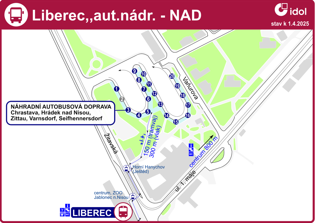 • Ersatzbusse mit allen planmäßigen Halten fahren von Liberec über Chrastava, Bílý Kostel und Chotyně nach Hrádek nad Nisou bzw. Zittau.