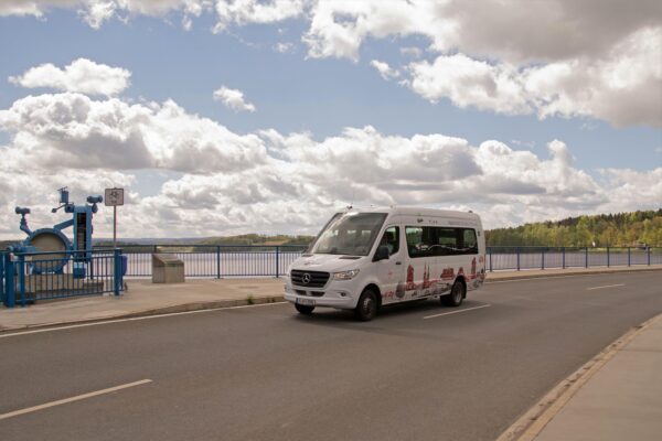 Bildunterschriften: Der SaisonBus 74 auf der Staumauer der Talsperre Pöhl. © Foto: Verkehrsverbund Vogtland GmbH