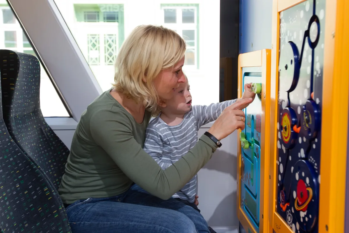 In the children’s play area on our trains, even young passengers can enjoy a fun and entertaining journey. Large play modules help little ones pass the time, keeping them happily occupied even on longer train rides. Parents can already see on the platform where the children’s area is located on the train: Weuli, the waldbahn mascot, shows the way.